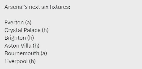 阿森纳未来6场比赛:客战埃弗顿、主战水晶宫、主战布莱顿、主战维拉、客战伯恩茅斯、主战利物浦。